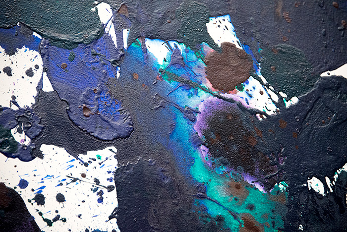 One of his more unusual techniques was using Photo-Flo, a wetting agent for developing film, which gives the surface a watercolor-like quality. Applying Photo-Flo caused the colors to run together and merge in varying ways, producing unexpected shapes and designs from a seemingly random technique. With Photo-Flo and other means, Francis varied the surface texture and the degree to which it reflects light. Some areas are glossy, others matte; some smooth, others richly textured.