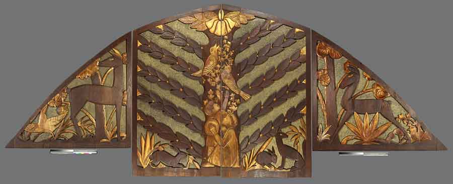 Sargent Claude Johnson, Screen, 1937, 105 x 264 x 2 in. (266.7 x 670.6 x 5.1 cm.), carved, gilded, and painted redwood. Purchased with funds from the Art Collectors’ Council, the Connie Perkins Endowment, and the Virginia Steele Scott Acquisition Fund for American Art in honor of George Abdo and Roy Ritchie. The Huntington Library, Art Collections, and Botanical Gardens.