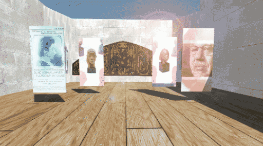 An animation that shows the first gallery of a virtual reality exhibition. In the background is a 3D model of the Sargent Johnson panel that is located at Berkeley; students digitized historical items (yearbook materials, WPA photos, and census data) related to the California School for the Deaf and Blind to help contextualize the object.