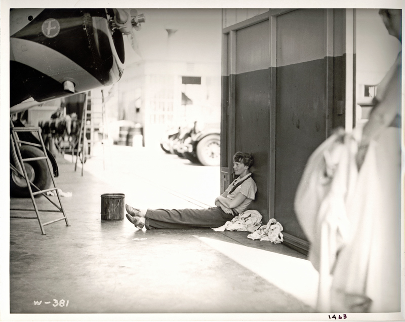 Amelia Earhart takes a break on the Lockheed factory floor in the early 1930s. Earhart presented a glamorous public image but knew her way around an airplane and an aircraft plant. She was a frequent visitor to Lockheed to keep tabs on the construction of her newest airplanes. Huntington Library, Art Collections, and Botanical Gardens.